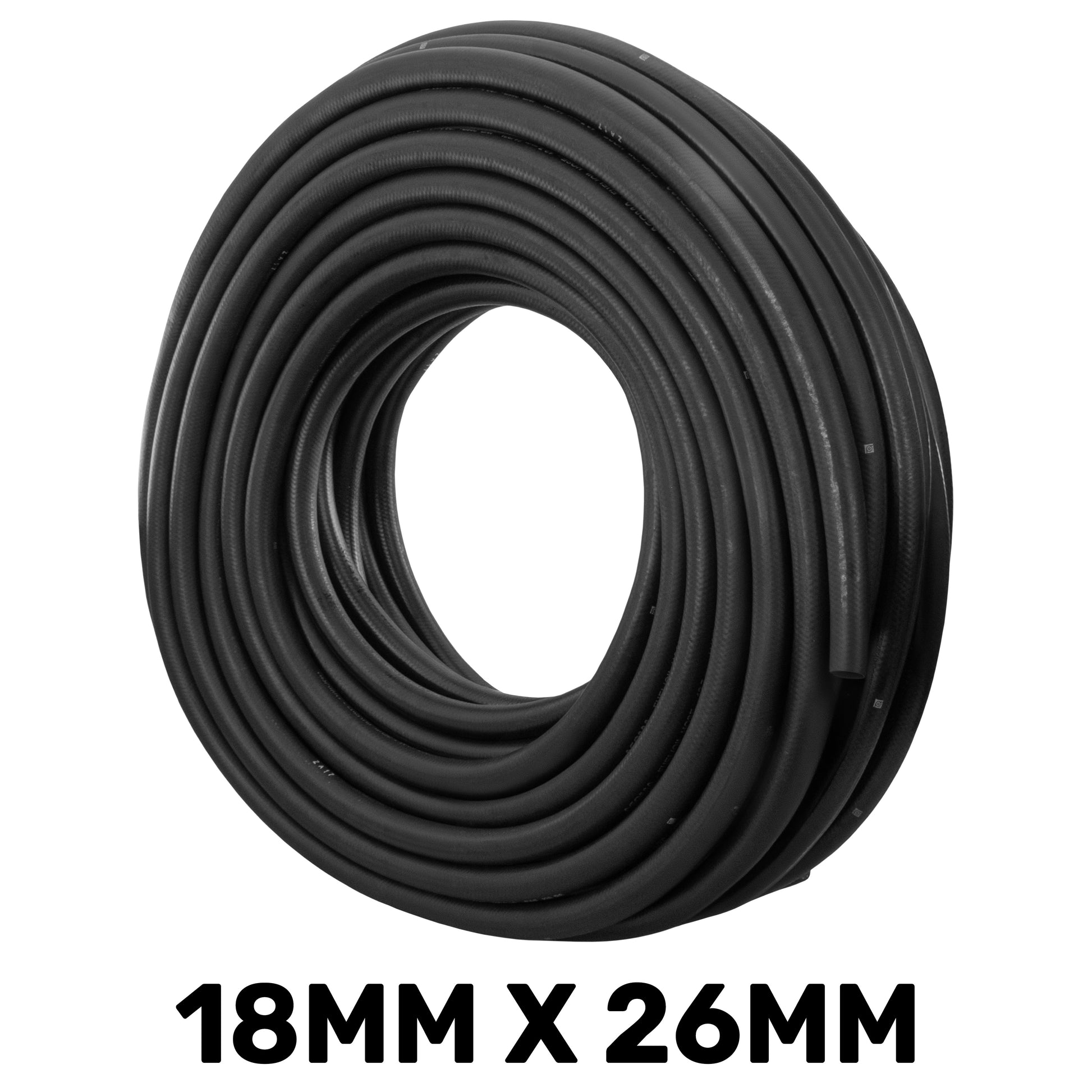 Agoma SAE J30 R6 NBR fuel hose with an 18.0 mm internal diameter, 26.0 mm external diameter and a 4.0 mm wall thickness, engineered for high-volume fuel, oil and lubricant transfer in the most demanding industrial, automotive and marine environments. Crafted from premium nitrile butadiene rubber (NBR) and reinforced with a high-strength dual-thread braid, its sleek black finish delivers outstanding resistance to fuel permeation, chemical attack and abrasion for extended service life.
