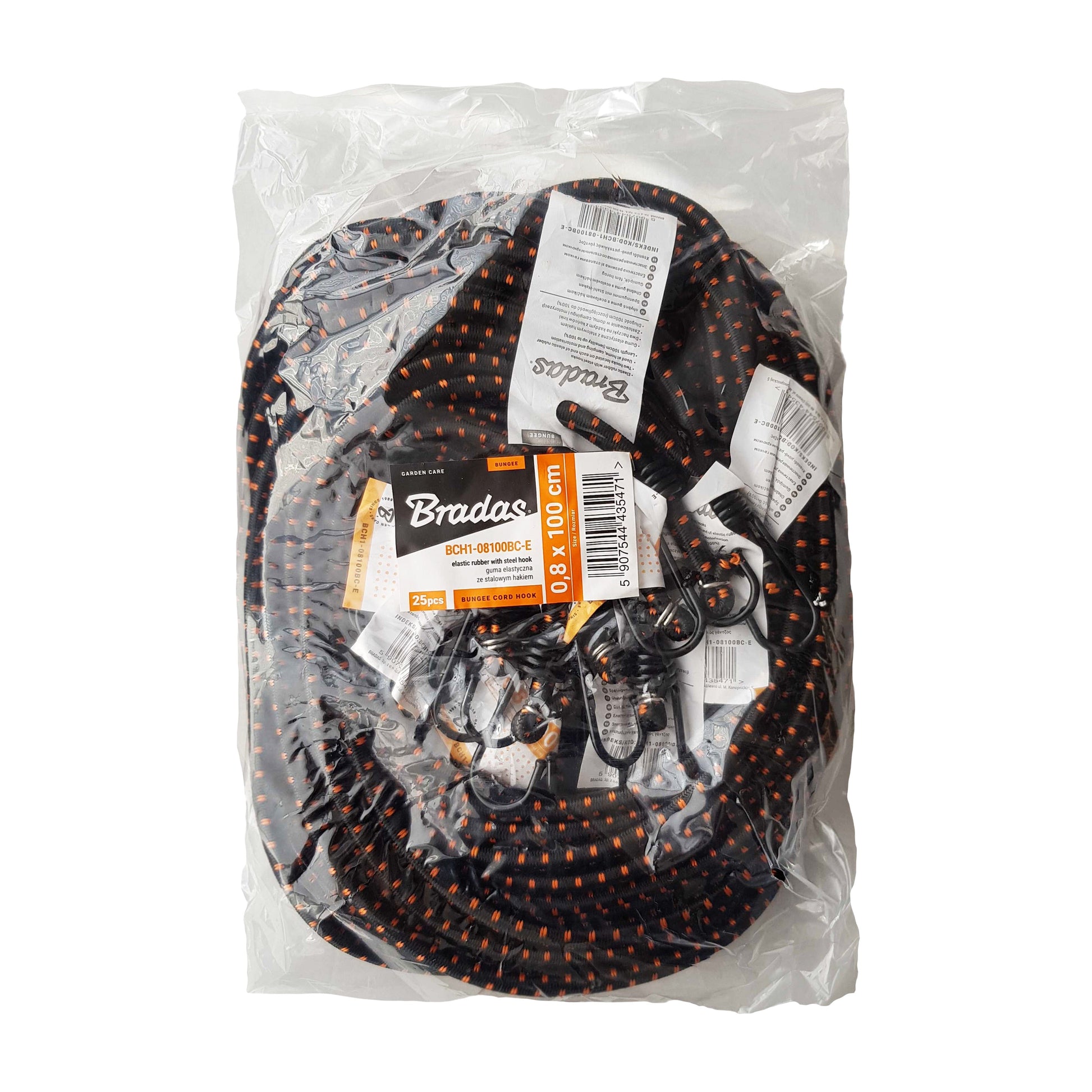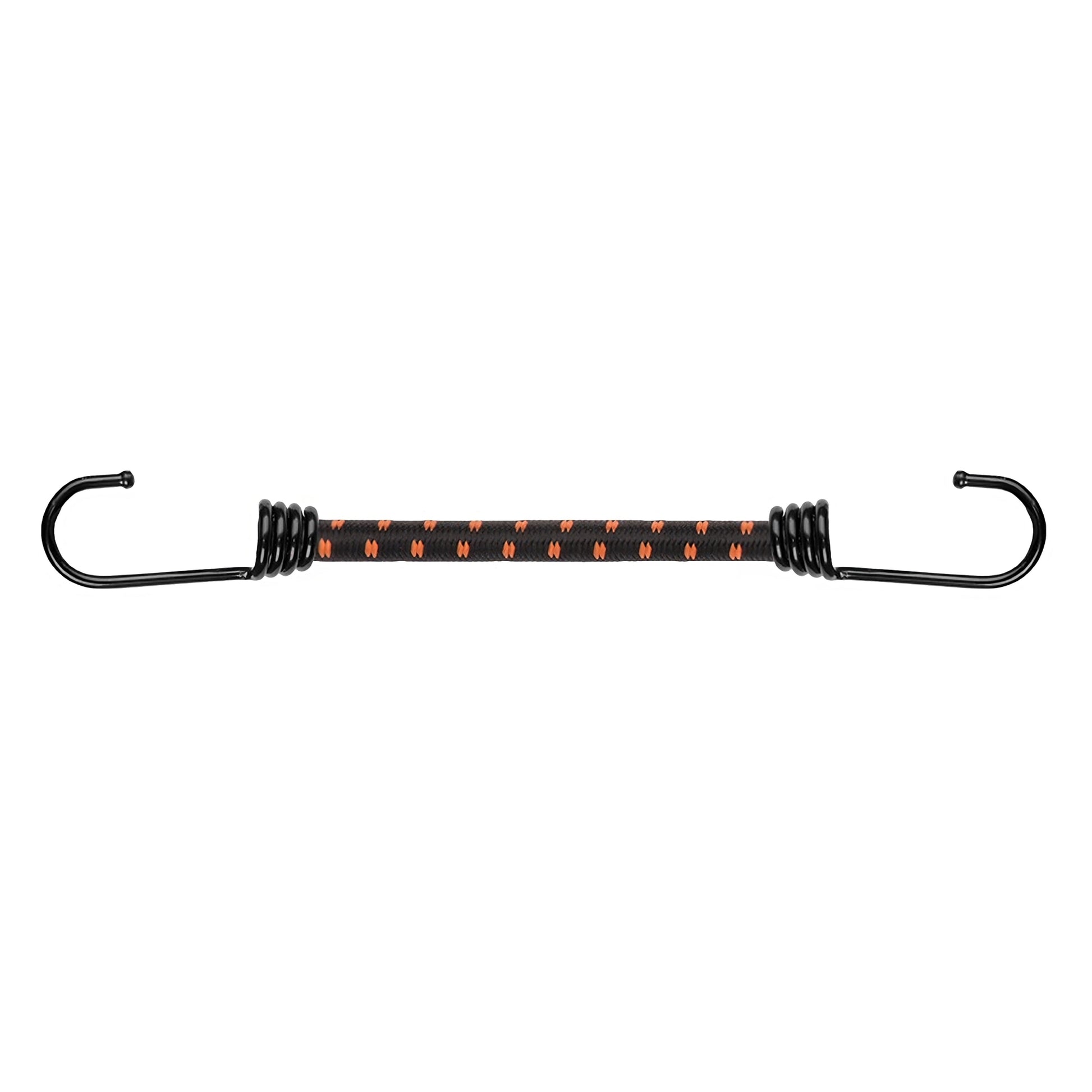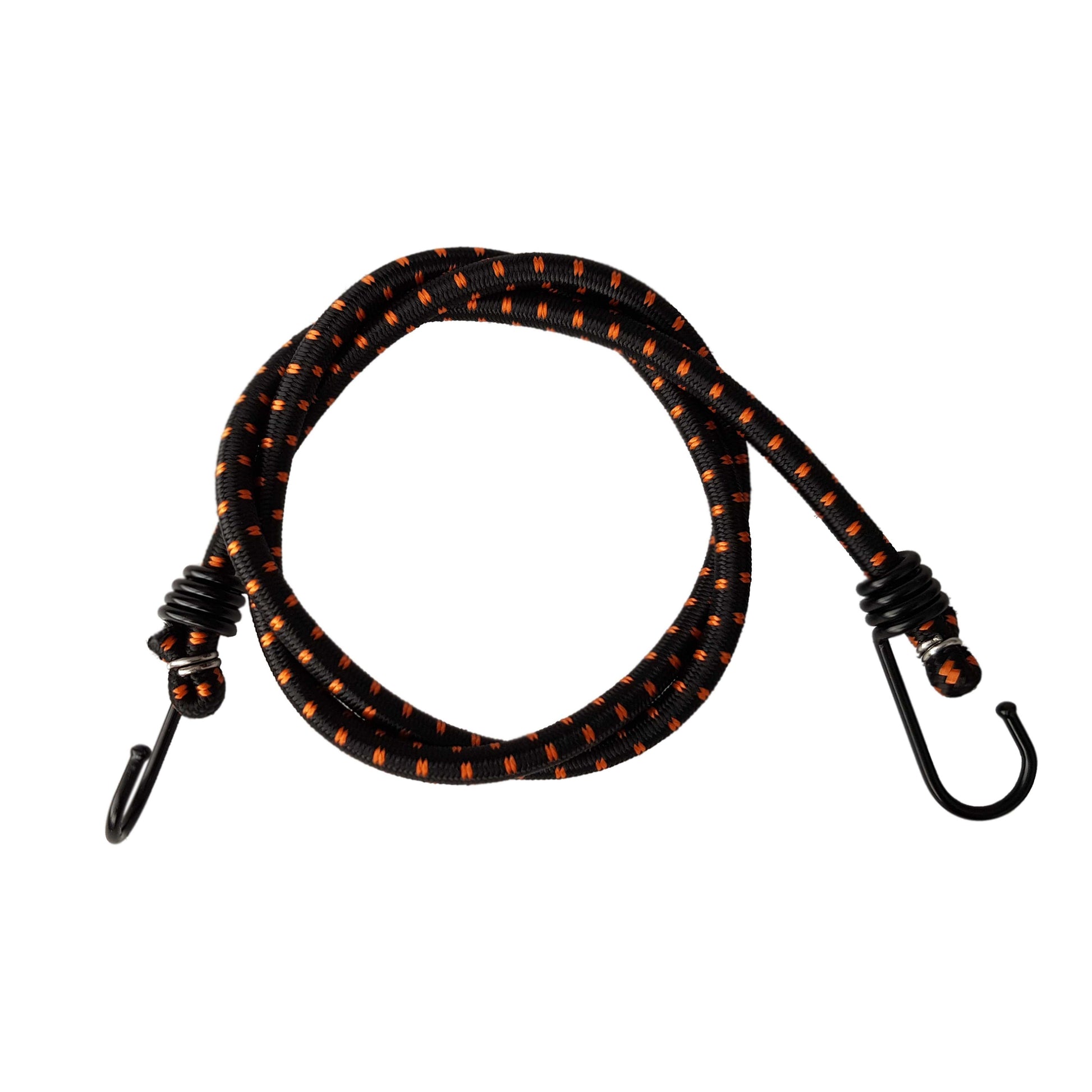Robust and reliable, this black and orange bungee cord with corrosion-resistant metal hooks delivers a versatile fastening solution for both professional and leisure tasks. Its premium latex rubber core stretches up to 100 % of its original length, while the tough polypropylene braid offers superior abrasion resistance and weatherproofing. Measuring 100 cm (39.37″) overall at 8 mm thickness, the hooks feature a 2 cm inside spacing, fitting securely onto bars and rails up to 2 cm thick. Whether you’re lashing down luggage on roof racks, tensioning tarpaulins, securing camping equipment or organising garden storage, the quick-attach metal hooks provide a firm grip under pressure. Perfect for tourism, agriculture, home, garden and camping, this bungee hook cord combines strength and stretch for dependable performance in any condition.