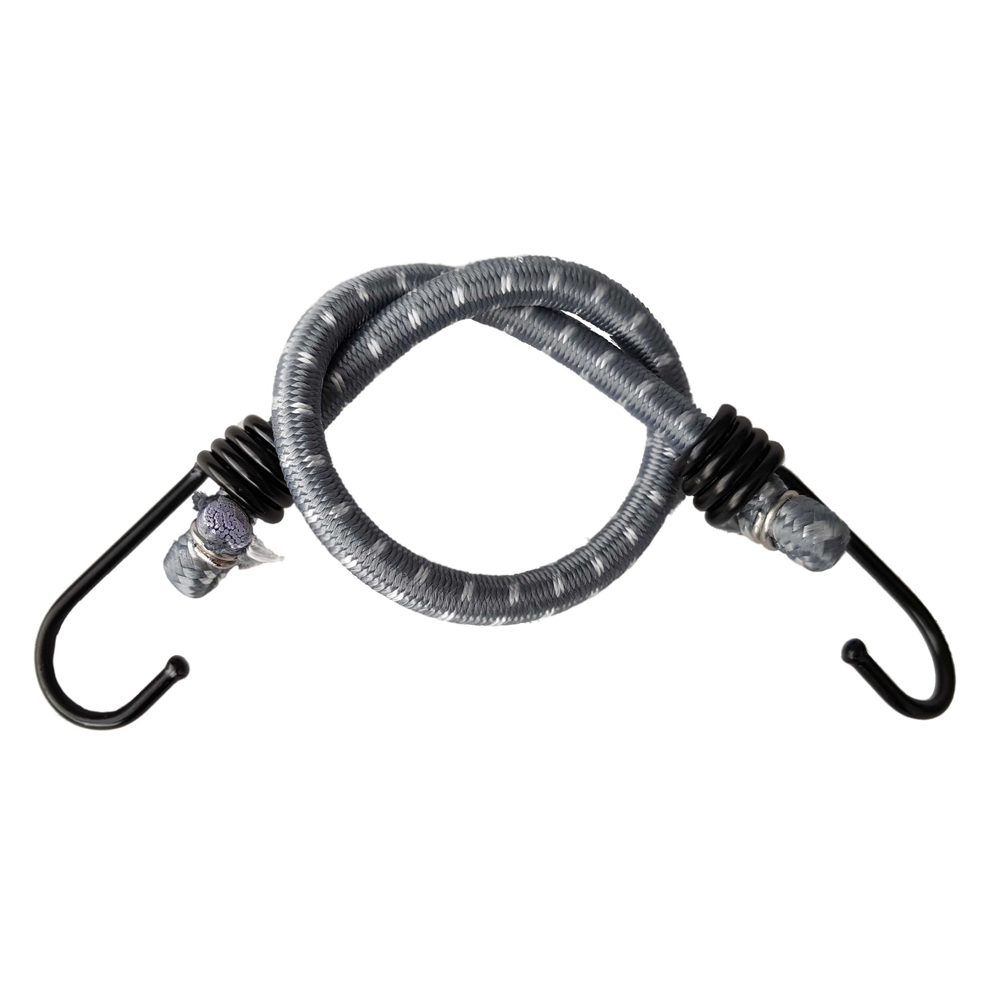 This versatile grey and white bungee cord with sturdy metal hooks offers a heavy-duty solution for securing, bundling and tensioning across professional and recreational tasks. At 40 cm (15.75″) overall length and 8 mm thickness, its high-quality latex rubber core stretches up to 100 % of its original length, while the robust polypropylene braid provides weather-resistance and wear protection. The corrosion-resistant metal hooks feature a 2 cm inside spacing, accommodating bars and rails up to 2 cm thick for secure attachment. Whether you’re fastening luggage on roof racks, holding tarpaulins in place, organising garden tools or securing outdoor furniture against gusts, this bungee hook cord combines durability and elasticity for reliable performance in all conditions.