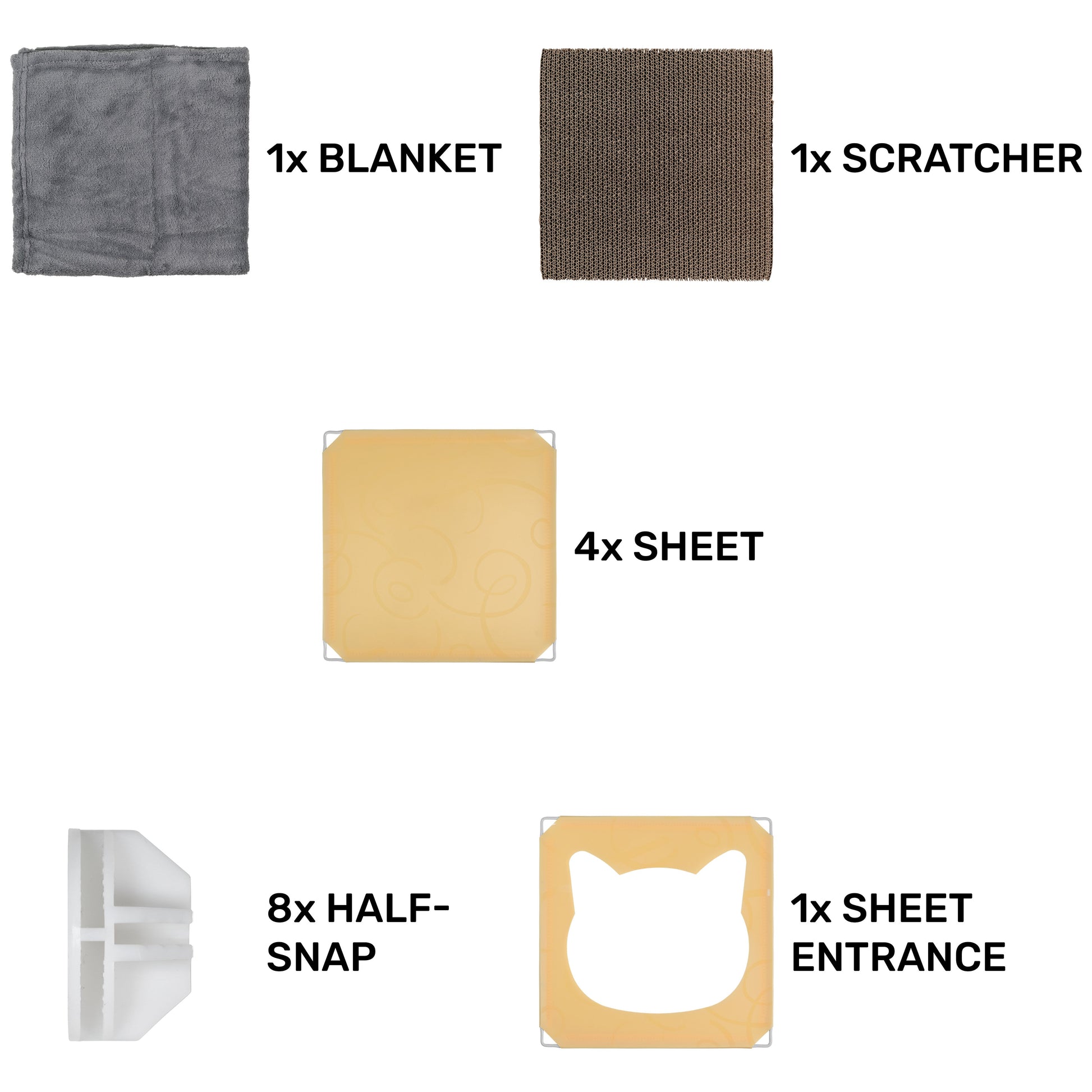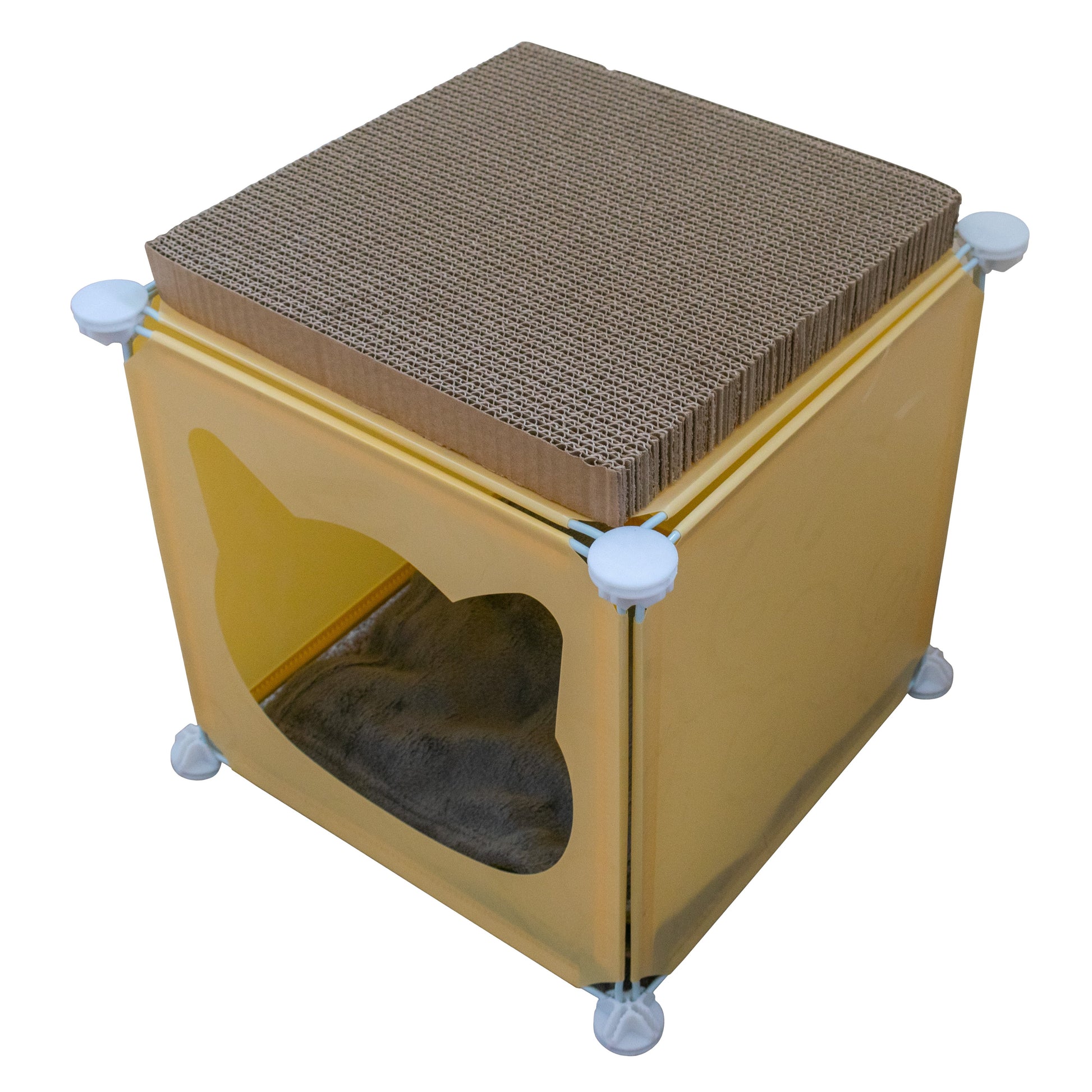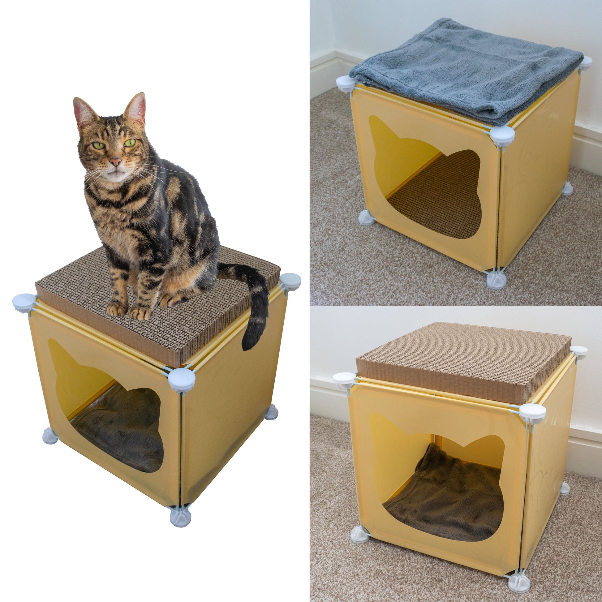 This buildable cat tower cube lets your feline climb, hide and rest in one versatile unit. Measuring 30 cm × 30 cm × 30 cm, it snaps together in seconds with tool-free connectors to form a secure, multi-level playground tailored to your cat’s instincts. One panel features a rounded entryway for a private hideaway, while the integrated cardboard scratcher satisfies scratching urges and keeps your furniture safe. A soft, removable fleece blanket adds extra comfort for cosy naps, and the robust, wipe-clean panels ensure a hygienic retreat that’s effortless to maintain. With clear, illustrated instructions, you’ll have this modular cat cube ready in minutes—perfect for encouraging climbing, exploration and restful snoozes in any room.